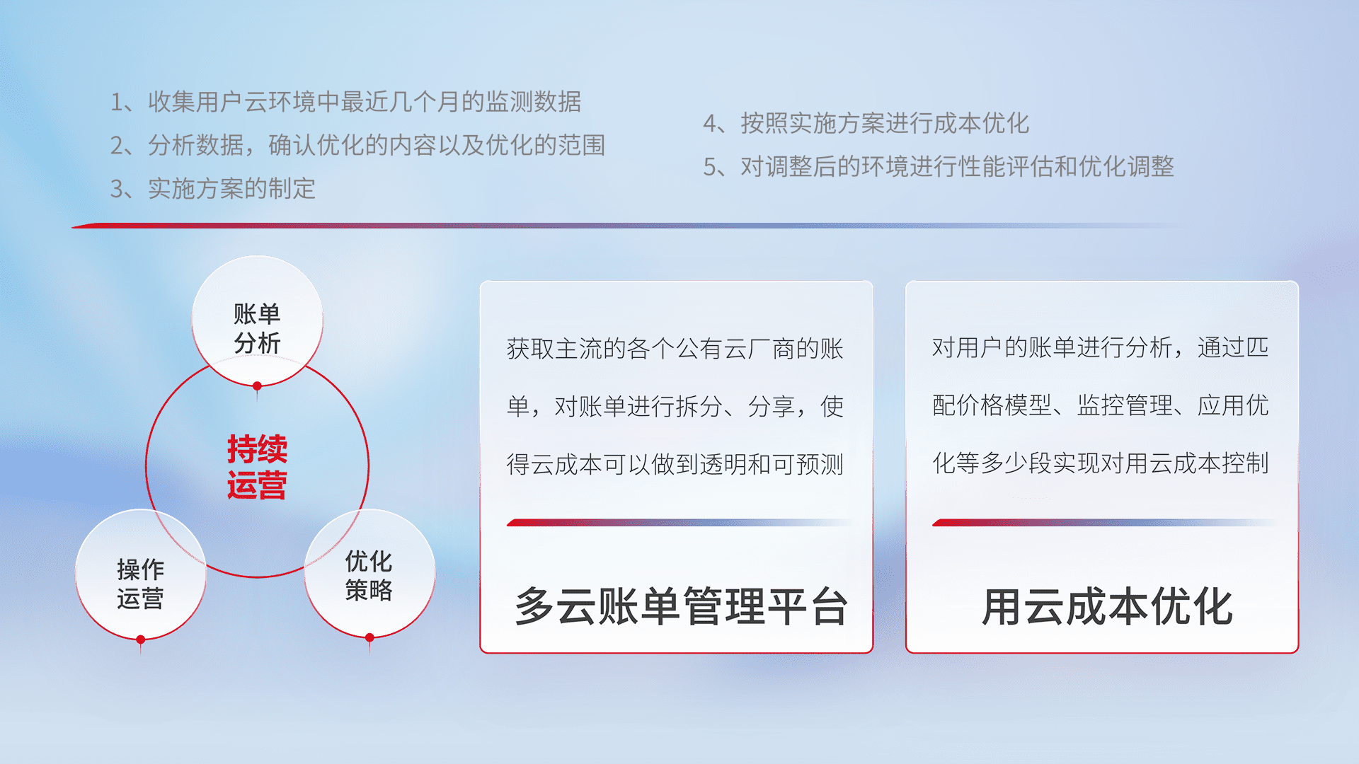 通过多云纳管,,,以统一的资源数据模型把客户的云资源进行抽象和封装,,进而实现对多云资源的统一操作,,保障云资源管理的可靠性、、、、稳定性与可用性。。。量身定制化运维内容,,配置、、、开发运维、、、、补丁管理、、备份、、、、监控、、认证和访问管理、、审计和日常巡检等,,,,保障在用云过程中的可靠度,,,稳定度以及高可用率。。。。